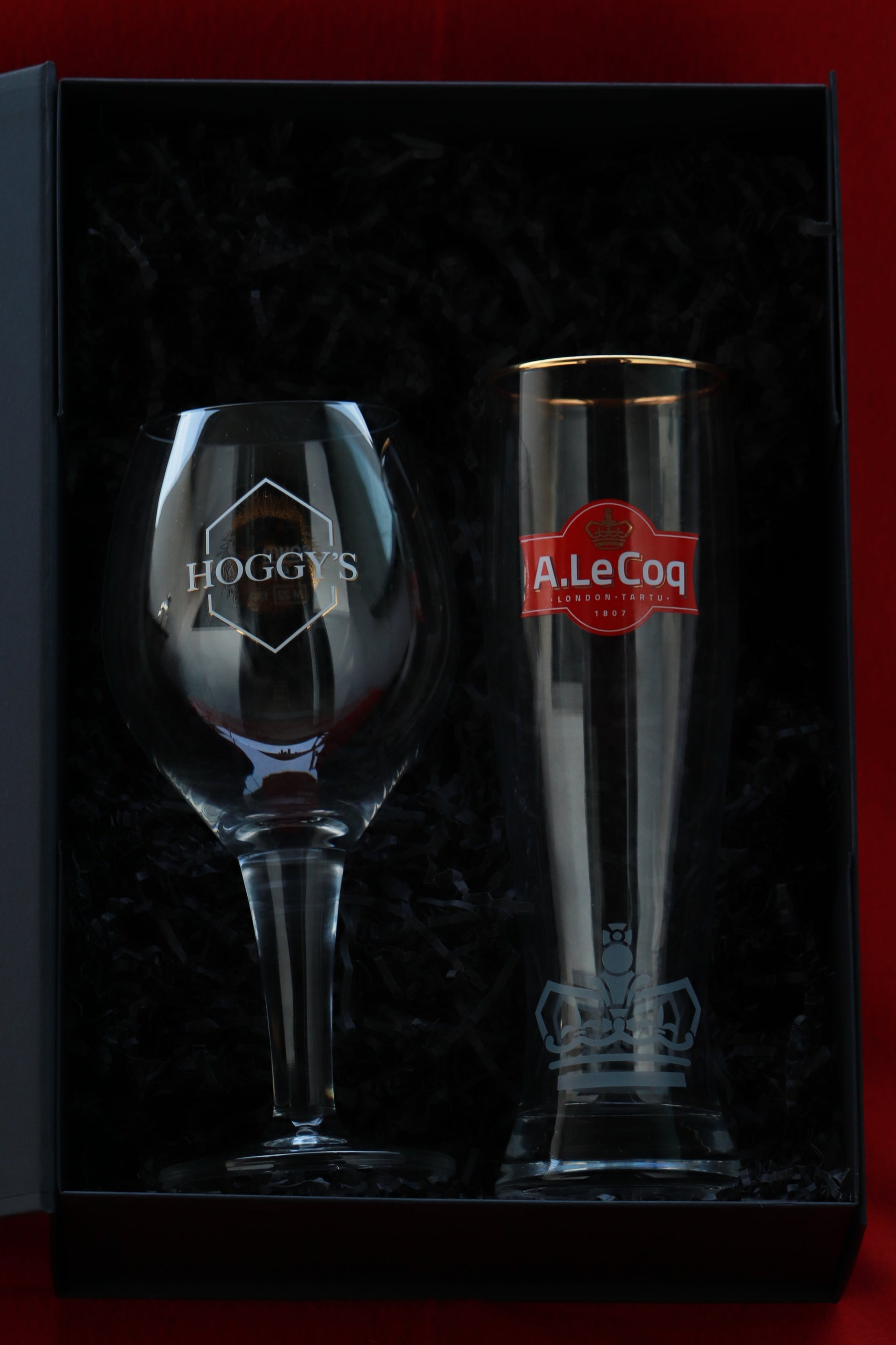 Kahe erilise klaasi komplekt stiilses mustas kinkekarbis – ideaalne lahendus paaridele jagamiseks ja pidulike hetkede tähistamiseks.